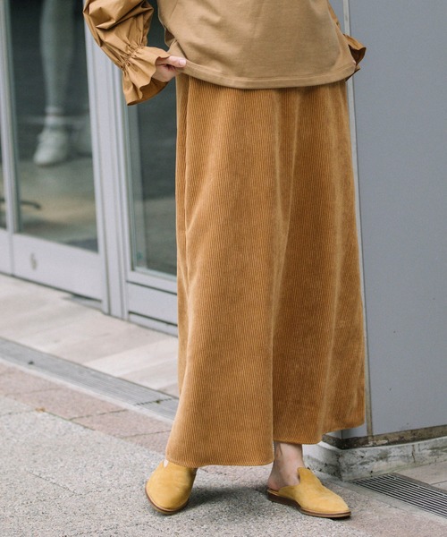 □2020 AUTUMN&WINTER COLLECTION□<CLASSY 11月号掲載>◆マーメイドシルエットが女性らしさを引き立てるレトロシックなロングスカート◆<MATERIAL>ポリエステル/ナイロンの程よいハリ感と柔らかさが共存した太コールです。コットンベースのコーデュロイとは違った雰囲気の表面感で、身体のラインを拾わない程度のドレープ性があり、カジュアルすぎない印象の素材です。<DESIGN>絶妙なマーメードシルエットに拘った、レトロシックなマキシスカートです。ヒップはすっきりとしたサイズ感で、膝から少し脇のラインを削り、ふんわりとした裾のラインに繋げ綺麗なマーメドラインを作り上げています。脇のラインを削ることによって、腰周りがスッキリし、スタイルアップ効果が生まれ大人っぽいアイテムに仕上げています。ゆるかなマーメードシルエットは、コーディネートしやすく大人も取り入れやすいスカートです。コーディロイ素材なので、よりカジュアルな印象と暖かみを加えてくれます。すっきりとしたタイトスカートとふんわりとしたフェミニンなフレアスカートの長所をアレンジしたMunichらしい大人シルエットです。後ろのベルトはゴムになっているので、ストレスフリーな穿き心地です。<COLOR>■ブラック:使い勝手のよい正統派ブラック。きりっとハンサムに決まる細見え効果の高く、オンオフ問わずに使いやすい1本です。■パープル:深みのある濃いパープル。上品な大人パープルです。■キャメル:黄味を抑えた落ち着いた印象のキャメル。こっくりとした秋らしさと品のある女らしさがのぞくカラーです。*お取扱いについては、商品についております品質表示にてご確認ください。洗濯:手洗い可.............................≪INFORMATION ≫............................▼商品のお気に入り登録▼『♡』マークを押してお気に入り登録して頂いた商品は、セール開催の通知やクーポン発行などのキャンペーンなど、お得な情報をいち早く受けとる事が出来ますので、ぜひご登録ください。