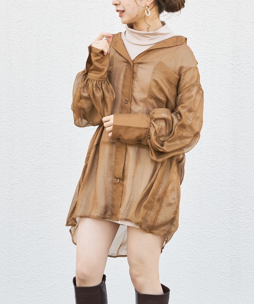 完売カラーが再入荷しました!(他カラーは下記関連商品よりご覧ください)光沢感のある箔プリントを施したシアーシャツです。ブロッキングのデザインがシルエットを綺麗に見せてくれます。秋冬にぴったりなヌーディーカラーで透けても上品さが漂い、このシャツ一枚でこなれ感を演出してくれます。羽織としてお使いいただくのはもちろんですが、ボタンを閉めてチュニック風に着るスタイリングもとてもおすすめです。▼お気に入り登録のおすすめ▼【気になるアイテムを登録】♡をクリックしてお気に入りに登録すると完売カラーの再入荷やラスト1点の通知、セールの通知を受けとることができます。【ブランドを登録】新商品や再入荷など、いち早くブランドの情報を受けとることができます。是非ご利用頂き、お買い物をお楽しみ下さい。