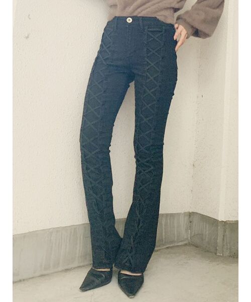 美脚に見えるよう拘った裾に向けてのフレアシルエットと、センターのレースアップデザインがGYDAらしいPTです。ストレッチも効いているが◎