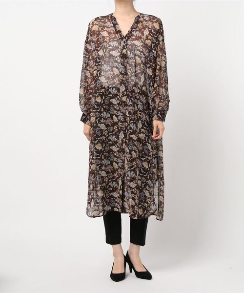 流行のダークフラワー柄のワンピース。 前を開けて羽織としても着用出来きとても便利な1枚です。 バックスタイルのデザインが特徴で、一枚で着ても様になります。 透け感があり今年らしい1枚です。