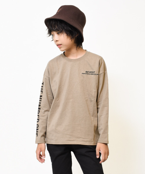 袖ロゴプリントロングTシャツ 今期注目の袖ロゴプリントのロングTシャツ。 右袖のみのプリントでアシンメトリー仕様なのがお洒落なポイント。 程よいビッグシルエットにすることで使い勝手のいい1枚に仕上がっております。