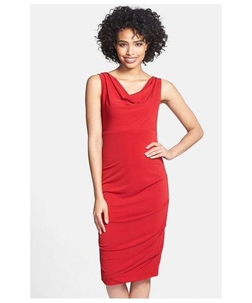 An elegant cowl neckline highlights the smooth drape of a stretch-crepe sheath dress, shaped to flatter with strategically situated tucks at the back and side seams. 39 1/2" length (size 8). Back zip closure. Lined. Polyester/spandex; dry clean. By Nicole Miller; made in the USA. Dresses.