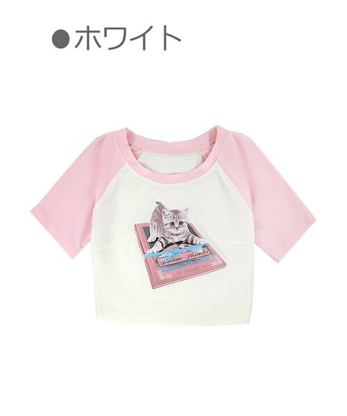癒しの伏せポーズのこねこがプリントされたチビT チビサイズでイマドキのトレンド感アップ ショート丈でウエスト周りの肌見せ度UP ボトムス次第で簡単にスタイルチェンジ可能 カラーは「ホワイト」1色のみの展開