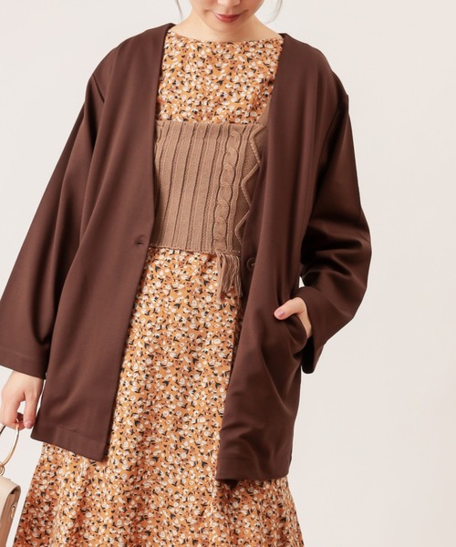 【2020AW natural couture】 この秋着たいノーカラーゆるっとジャケット 柔らかなレーヨン混じりの生地を採用した、ゆるっとリラックス感のあるノーカラージャケットが登場しました。程よいミドル丈のお作りで、ワンピースにも、パンツスタイルどちらにも合わせやすく、低身長の方にもおすすめのジャケットです。フロントにはシンプルなシングル釦を仕様し、肩まわりを華奢に見せてくれる程よいドロップショルダーのデザインで、さらっと羽織るだけでキマる1着。女性らしい柔らかな秋カラーの色展開もポイント。どんなコーデにも取り入れやすいライトベージュ、ベージュ、ピンク、ダークブラウンの4色でご用意しました。同素材の【321510110:モクロディセンタープレスパンツ】【321700350:モクロディフレアキャミワンピース】と合わせたセットアップコーデもオススメです。