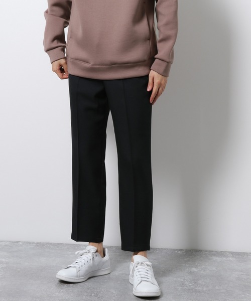 ベーシックなストレートパンツ。センタークリースをプラスすることで、よりクリーンな印象に。ウエストはゴム×内紐のイージーパンツ仕様なので、ラクチンな穿き心地です。【素材】トレンドのポリエステルツイル素材を使用。軽い穿き心地で、キレイめな見え感が魅力です。【スタイリング】どんなアイテムとも合わせやすい1本。カジュアルなTシャツと合わせても、キレイめな着こなしに仕上げてくれます。同素材のシャツと合わせたセットアップスタイルも◎