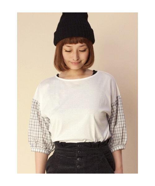 袖ストライプの切り替えが可愛いプルオーバー。デニムボトムとの相性◎。※袖、後見頃はチェック生地になります。