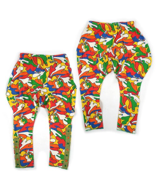 ペンタ君とペンキのインクをモチーフ、うねうねと色とりどりの世界を表現したイロイロ柄のロングパンツ。風合いの良いランダムパイルを使用しています。お尻はたっぷりとゆとりがあり、ブーツなどと合わせて1枚でもコーディネートして頂けるデザインになっています☆ウエスト総ゴムなのでラクチンです。