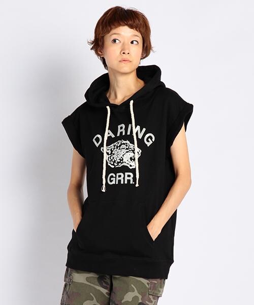 フロッキープリントで仕上げたロゴや、ワイルドなヒョウモチーフが自慢のパーカチュニックです☆折り返した袖口&長めの着丈で、すっきりと見えるのがグッドポイント。フロントに配したポケットも見逃せないディテールです。