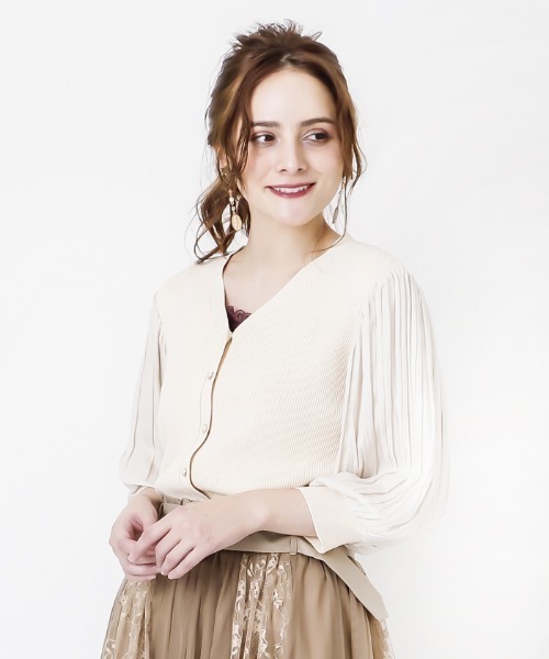 ヴィンテージサテン生地にプリーツを施したお袖がかわいいニットカーディガン。身頃のニットはカット素材のような素材感で、毛玉ができにくくさらっと着ていただけるのでおすすめです。ウエストがきゅっとしたデザインで前をとじてトップスのようにきていただくのも◎。お仕事使いからおうちコーデにもつかえるおとなかわいいカーデです。