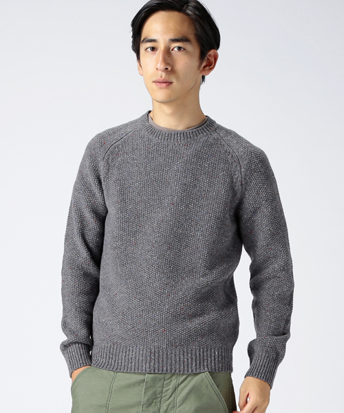 ◆B:MING LIFE STORE by BEAMS タブロイド”Gooday.” VOL.8掲載商品◆ ◆単色のボディに鮮やかなカラーネップが映えるクルーネックニットです◆ ITALYカラーネップ糸を使用したカノコ編みのクルーネックニットです。SUPER100Sの糸を使用しドネガルツイードを表現した、高級&都会的な洗練された雰囲気を演出しています。単色ながらも色鮮やかなカラーネップと、カノコ編みによる編地がデザインのポイントになっています。クリーンカジュアルからストリートまで、様々なコーディネートに取り入れやすい汎用性のあるニットです。 「ドネガルツイード」 ハリスツイードと並び、ツイードの代表的な素材として人気の高い。アイルランドのドニゴール地方の農家が手紡ぎ・手織りで作る素朴なホームスパンです。紡毛糸の太さにムラがあり、色のついた節糸(ネップ)が特徴的なラフで素朴な風合いの毛織物です。 現在では、いろいろな色の糸を生地表に織りだしたネップを持つもの、またこういった手紡ぎ・手織りで織り上げた粗い毛織物のことをドネガルツイードと総称されています。 Model:H179 B81 W68 H89 Size:M 店舗へお問い合わせの際は下記品番をお伝えください。品番:92-15-0065-147