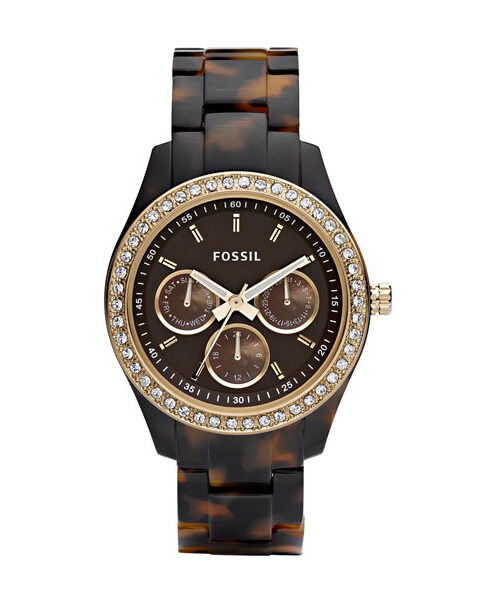 Sparkly crystals encircle a three-eye dial displaying day, date and 24-hour time in a pretty watch fashioned from smooth resin. 37mm case; 17mm band width. Adjustable bracelet. Links can be removed at your local Nordstrom. Find a store . Deployant clasp closure. Mineral crystal face. Stainless steel/resin/Swarovski crystals. By Fossil; imported. Fossil Watch Instruction Manual PDF