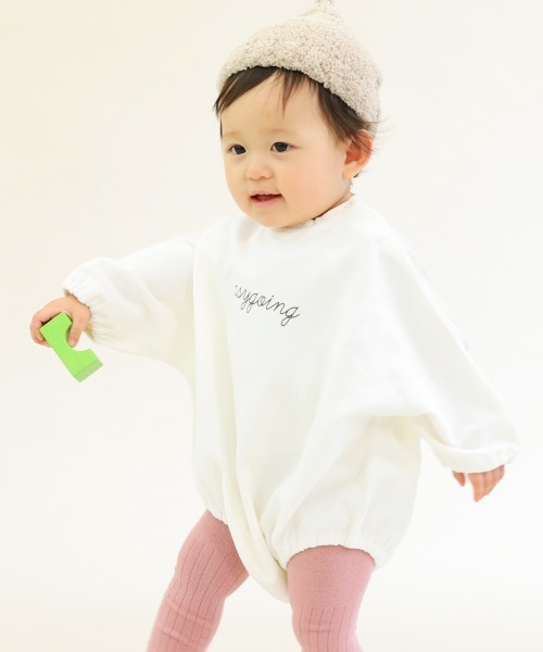 動きやすい『スウェットロゴロンパース』 ゆるっとしたシルエットが愛らしさもありつつ動きやすさも兼ね備えた1着。 さりげない胸元のロゴデザインもポイント〇 レギンスと合わせたコーデもおすすめです。 ■素材■ 短いパイルで編みたてた、軽い着心地のミニ裏毛 スウェットの見た目ながらも薄手なため、軽い着心地のミニ裏毛。 綿100%で肌ざわりが良く、吸汗性にもすぐれているので快適に着こなせます。 ■ディティール■ 伸縮性:あり ・股下はスナップボタン付きです
