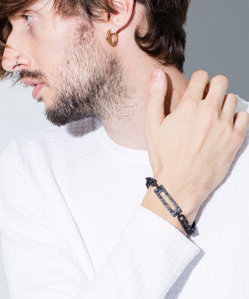70年代風のレトロな雰囲気を感じる2種類のチェーンを使用し、IDプレートを挟んでチェーンの種類を変えたアシンメトリーデザインのIDプレートブレスレット。通常IDを記すプレート部分は中央をくり抜いて無記名とし、まさにブランド名「NO ID.」を体現するプレートデザインに仕上げた。見た目と重量感に比べてリーズナブルなプライスで手首周りの彩りとして挑戦しやすいアイテム。