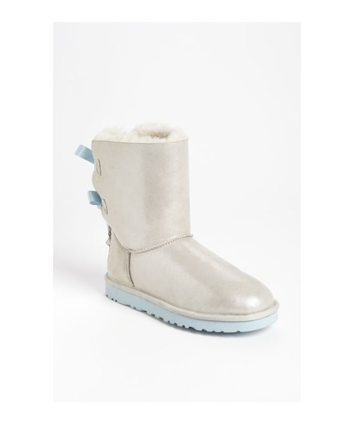 "Something blue" bows dance down the back of an iconic boot prettied up with metallic shimmer. The soft, cozy lining is made from genuine shearling with a plush UGGpureTM footbed to keep feet warm and comfortable. UGGpureTM is a moisture-wicking textile made entirely from wool but crafted to feel and wear like genuine shearling. 7 3/4" boot shaft (size 9). Suede upper/genuine shearling and wool lining/EVA sole. Shearling may be sourced from Australia, China, Italy, New Zealand, Spain or USA. See packaging for confirmed country of origin. By UGG Australia; imported. Women's Shoes.