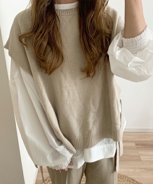 ベーシックに合わせやすいニットベスト。 ワンピースやロンT、ブラウスなどと相性がよく合わせやすいので秋にぴったりのアイテム◎ サイドのリボンはラフに垂らすのもよし、リボン結びしてもかわいいです。