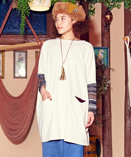カラフルなネップヤーンのカットソーをベースに、様々な異素材を組み合わせた遊び心のあるデザインのチュニックワンピース。 ポケット部分には温かみのある起毛の幾何学柄を、袖口は伸縮性のあるジャガード生地をプラスしました。 ビッグシルエットでゆったりとリラックス感があり、ノンストレスな着心地です。秋冬のカジュアルコーデはもちろん、おうちスタイルやワンマイルウェアとしてもおすすめです◎ ※こちらの商品は1点1点職人による手作りとなります。その為、生地の取り方により柄の配置や形・色合いなど若干異なる場合がございます。(画像は一例です。)あらかじめご了承ください。 Amina Collection Co.,LTD.