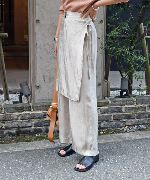 ◆アイテム詳細◆ 【Marient 20A/W】 スカートとパンツをレイヤードしているようなデザインで、シンプルなトップスに合わせるだけでお洒落に見せてくれます。 質感も落ち着いた高級感があるサテン素材を使用し、動きが出やすいので歩く度に、サロン部分のサイドのスリットから中のパンツが見える凝ったパンツです。 ヴィンテージのような色味・風合いがのコーディネートをワンランク上に見せてくれます。 ーーーーーーーーーーーーーーーーーーーーーー 【COLOR】ベージュ・カーキ・ブラック 【SIZE】Fサイズ 平置き(㎝) 着丈100 サロン丈58 ウエスト32-36(後ろゴム仕様) ヒップ50 股下69 裾幅27 【素材】本体 ポリエステル100%