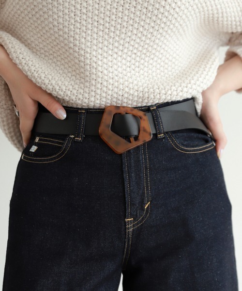 べっ甲のようなマーブル柄のバックルを使用したベルト。 大きめのバックルが、シンプルなスタイリングのポイントになってくれます。 ホールがないタイプなので着用サイズは自由に調節できます。 ボトムはもちろん、ニットやアウター等のウエストマークにもオススメです。 ※バックル部分の柄に個体差が生じるアイテムとなっております。 ※撮影環境により、光の当たり具合で 色味が違って見える場合があります。 あらかじめご了承下さい。