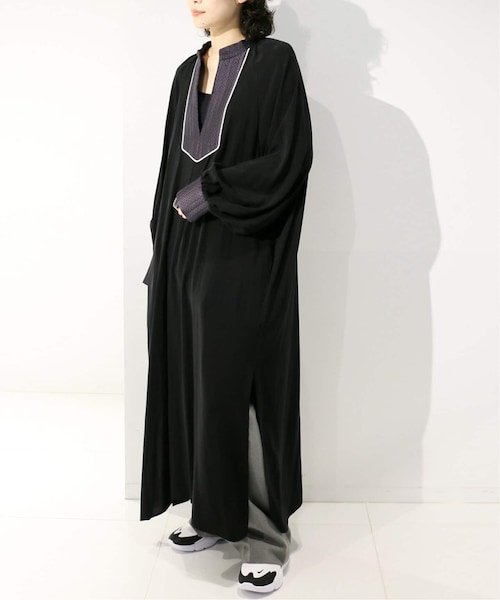 【2020AW】CITYSHOPオリエンタルな要素ながらモード感のある着こなしが叶うワンピース。ブラックの落ち感があるワンピースの衿と袖に、パープルベースの生地を合わせたカフタンのデザインがポイント。カフス部分はギャザーをさりげなく入れて表情を出しています。裾のサイドには大きくスリットを入れ、ボトムとのレイヤードスタイルも軽やかに。たっぷりとしたシルエットで大人の印象ながらリラックスした着心地も実現するアイテムです。**********************透け感:なし裏地:なし伸縮性:なし光沢感:なし生地の厚さ:薄い**********************【スタッフ着用コメント】《スタッフ》身長:167cm/普段サイズ:M/着用サイズ:フリーサイズ感:私の身長でくるぶしより少し短い丈感でした。身長の低めの方はロングワンピース位の丈になりそうです。素材感:柔らかな落ち感のある素材です。カフタン部分の生地は少し膨らみがあります。着心地:身幅も袖幅も広めなので楽です。薄手のニットの上にも着られそうです。**********************※取り扱いについては、商品についている品質表示でご確認ください。※店頭及び屋外での撮影画像は、光の当たり具合で色味が違って見える場合があります。商品の色味は、スタジオ撮影の画像をご参照ください。