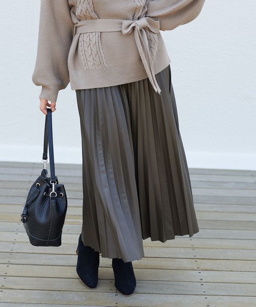 ◇今季トレンド!大人のエコレザープリーツスカート◇【Point】●トレンド感があり、秋冬にピッタリのエコレザーのプリーツが美しいロングスカート●上品なツヤと光沢感のレザーの質感が大人の女性らしさを演出●柔らかい生地感で着心地も快適●広がり過ぎないシルエットとプリーツの縦ライン効果ですっきり体型カバー●サイドジップ・ホック付きなので着脱もラクチン!【オススメStyling】・ニットベストやケーブルニットなど柔らかい風合いのトップスと合わせてメリハリの効いたコーディネート・シャツやブラウスを合わせたオフィスカジュアル・スウェットや裏毛パーカー、カットソーを合わせたカジュアルコーデ・アウターはショート丈のボアアウターやテーラードジャケットを合わせて、スカートが主役のコーディネート--------------------------------------------------------------生地の厚さ:やや厚手伸縮性:あり透け感:なし裏地:なし光沢感:あり洗濯方法:ドライクリーニング可--------------------------------------------------------------※商品のお取り扱いに関しましては、商品に付属のアテンションカード、洗濯ネームをご覧ください。※撮影場所やお使いのモニター環境により若干お色味が異なる場合がございます。特にロケの撮影では明るく見える傾向にございます。 --------------------《Information》--------------------【商品のお気に入り登録】→カートに入れる右側の【♡マーク】をクリック!完売カラーの再入荷通知やラスト1点の通知、セールの通知を受け取ることができます。【ブランドのお気に入り登録】→ブランドタグのページから【♡お気に入りショップに追加】をクリック!新商品や再入荷など、ブランドのお得な情報をいち早く受け取ることができます。是非ご登録頂き、お買い物をお楽しみください◎