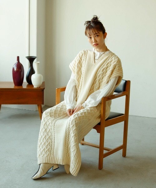 ◆風合いと立体感ある3Gケーブルがほっこりするケーブルニットワンピース 【特徴】 糸の特徴を活かした、ざっくりとしたケーブル編みが目を引くニットロングベストワンピース。 縦にざっくりと編み込んだケーブル柄が抜け感を演出し、 ロング丈でもスッキリと魅せてくれます。 柔らかいニット素材で風合いが可愛らしく、軽い着心地◎ ボックス型で身体のラインを拾わずゆったりと着られるのもポイント。 首元がスッキリ見えるようスキッパーデザインに仕上げました。 一枚で主役級になるデザイン性あるニットベストです。 【スタイリングポイント】 ゆったりと着れるシルエットなのでインナーに、 薄手のワンピースや袖ボリュームブラウス、Tシャツやパンツ合わせなどで レイヤードスタイルを楽しんで頂けます。 普段のコーディネートに1枚プラスするだけでこなれた感あるおしゃれな着こなしに◎