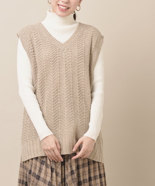 【洗えるニット】ロング丈がおしゃれなニットベストオーバーサイズでこなれ感のあるレイヤードが楽しめるニットベスト。ルーズなロング丈がおしゃれ見えするアイテムです。またゆったりとしたインナーとも合わせられるのが◎。ヘリンボーン柄のニットは大人っぽい印象を与えます。裾は前後で段差をつけてスタイリングにニュアンスをプラス。コンパクトなVネックで装いを上品にまとめてくれるアイテムです。裏地なし伸縮性なし薄手編み加減や染めの具合でデザインやサイズ等異なる場合もございます洗濯:洗濯機使用可