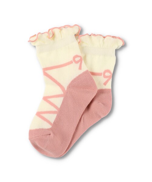 バレエシューズを履いている風のデザインが可愛いソックスです。後ろについたリボンに履き口部分のフリルデザイン×配色メロウがポイントです。