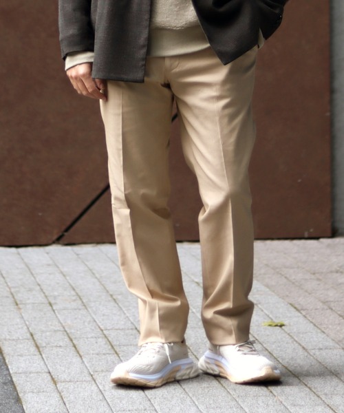 ストレッチ性のあるベーシックなコットン地を用いて、コストパフォーマンスの高いチノパンツに仕上げました。 カジュアルでの "大人キレイ目" なスタイルから、オフィスや、ビジネススタイルにもフィットする汎用性の高さはシーズンも問わない優等生。膝下からストンと落ちる流麗なシルエットは、センターに入ったくリースとあわせ、脚長効果も。