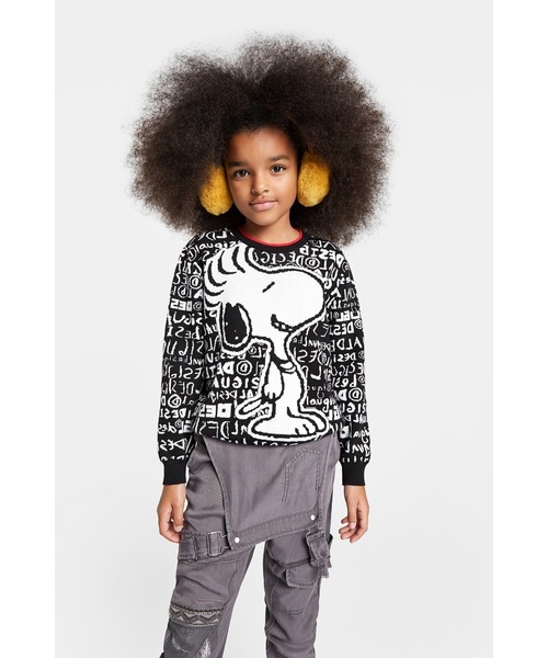 赤で縁取りを施したラウンドネックのニットセーター。ベースに白と黒のレタリングをあしらったデザインで、フロント面にはキュートな Snoopy のイラストをプラスしました。