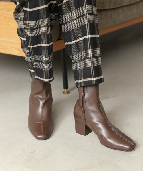ソフトなフェイクレザーを使用したアンクルブーツ。 トレンドのスクエアトゥも、履きやすいゆるやかなフォルムに抑えています。 筒まわりは、脚に沿うようにフィットして、歩きやすいデザインです。 旬な女性らしい足元に仕上がります。