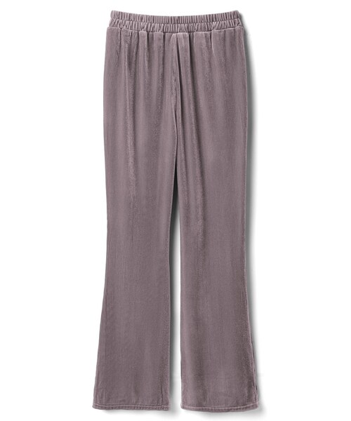 腰回りはスッキリと、裾広がりのフレアシルエットでスタイルアップ効果も期待できる。 ベロアの光沢が高見えのポイント。 柔らかく肌触りが良い素材でリラックス着にもおすすめのアイテム。 ウエストは全ゴムだからストレスフリーで履ける。 ★ウエストゴム入りです。 ★裏地付きです。