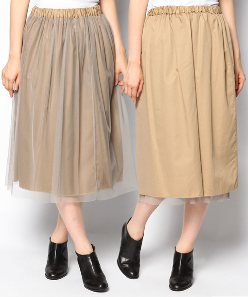 ハリのある布帛生地とフェミニンで軽やかなチュールをあしらったリバーシブルスカート。ウエストはゴムデザインでリラックス感のある仕上がりです。 一枚で二つの表情を楽しめるアイテム。トレンドのミモレ丈スカートで、今年らしいスタイリングをお楽しみください。 店舗へお問い合わせの際は下記品番をお伝えください。 品番:52-27-0264-012