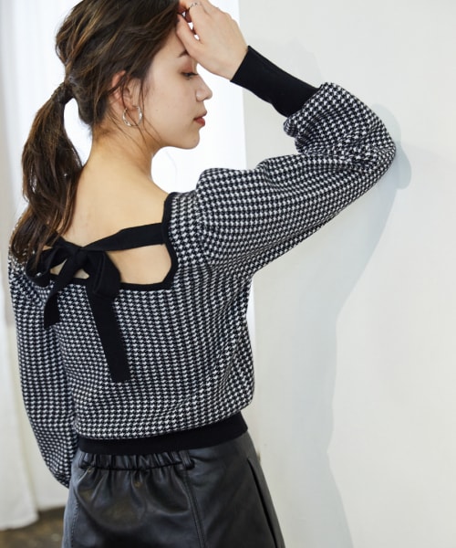 ◆こちらは先行予約商品です◆【デザイン】きちんと感のあるデザイン性の高いニットは普段使いはもちろん、デートやおめかしコーデにも◎後ろ姿が映えるバックリボンや、デコルテをキレイに見せてくれるスクエアネックなどフェミニンムードも高めな1枚です♪【素材】柔らかで肌触りのよいニット素材【スタイリング】ミニボトム、ロングボトム、どちらも相性抜群!ウエストINももたつかずキレイに着ていただけます♪