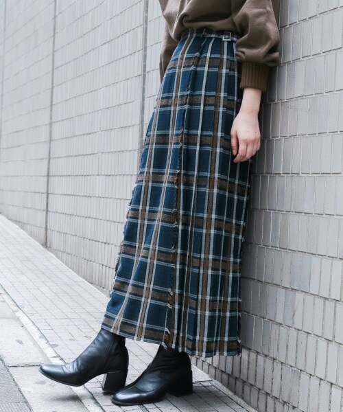 ◆秋冬に絶対に取り入れたいチェック柄タイトスカート◆起毛感のあるモール糸を生地に織り込んでいるのでふっくらとした立体的な表面感が特徴。スッキリしたAラインシルエットですが、サイド部分がプリーツになっていたりセンター部分の両端がフリンジ加工されているなど、細かい部分にもこだわった1枚です。ウエスト脇のベルトデザインはトップスインした際のポイントにも◎※撮影環境により、光の当たり具合で 色味が違って見える場合があります。 あらかじめご了承下さい。
