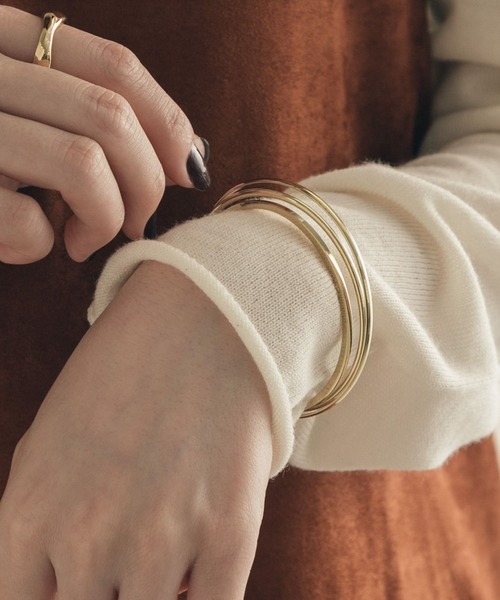 【女性らしさをグっと引き立てる】シンプルながらもデザイン性を感じさせるナロースリーラインバングルです。1本1本のラインの形が違うため、動きのあるデザインに。大人な女性らしさを演出してくれる1点です。※メッキ製品は変色してしまいがちです。こまめなお手入れで防止してください。アレルギー体質の方や体調が低下している方など、かぶれることがありますので十分にご注意ください。※アクセサリーは壊れやすいものです。取扱いにご注意ください。※その他お取り扱いに関しましては、商品に付属のアテンションタグをご覧ください。※モデルの着用画像の場合、光の当たり具合により、実際の色味と異なって見えることがございます。色味は、商品単体の画像をご参照ください。