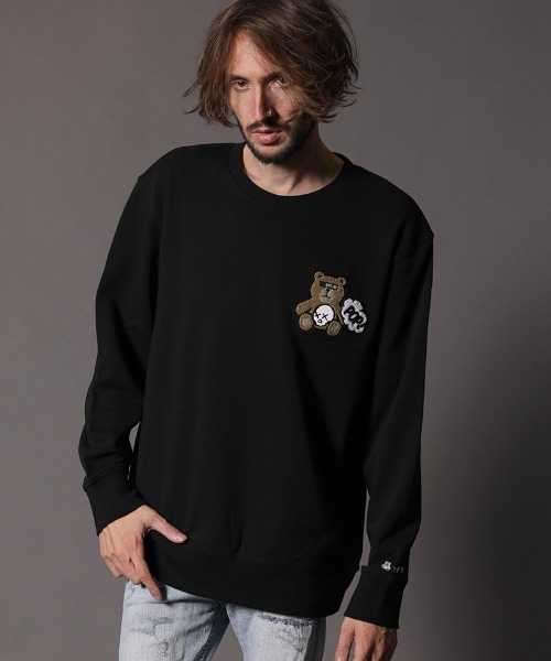 モデル182cm B:89cm W:73cm H:90cm モデル着用サイズ M.GRY/3 BLK/4 9oz コットン100%のミドルゲージ裏毛 STUDベアをサガラ刺繍で吹き出しデザインと一緒に付けています。 左袖口にも刺繍入ります。 ※画像の商品はサンプルです。 実際の商品と仕様、加工、サイズ、素材が若干異なる場合がございます。 ※生産の都合上、商品の納期が変更、また生産中止となる場合がございます。