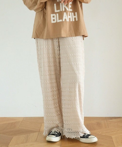 ◆華やかなレース模様が特徴のゆったりパンツ 【特徴】 細かなレースデザインが目を惹く定番のリラックスパンツ。 カジュアルな印象のゆったりボトムも女性らしい ラッフルレースでデイリー使いにもピッタリな万能アイテムに◎ 裏地付きなので、透け感もなく安心して履いて頂けます。 ウエスト周りもゴム仕様なのでストレスフリーな履き心が魅力♪ 【スタイリングポイント】 ブラウスやシャツと合わせてキレイ目スタイルや ロゴトップスやルーズシルエットのカットソーで カジュアルな着こなしもおすすめです◎