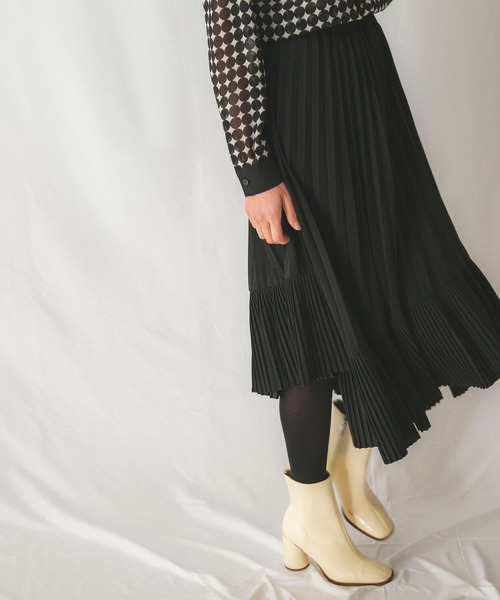 2種類のプリーツを組み合わせたアシンメトリーヘムが遊び心のある梨地スカート。ブラックカラーのみの展開となっており、柔らかなブラウスもキリリと締めてくれます。また、ランダムに揺れる裾が着こなしに動きをつけ、女性らしさを軽やかに演出。ウエストは、身体にすっきりフィットし、一日中快適に過ごせる総ゴム仕様です。・カラー展開はブラック(黒)・サイズ展開は1(M)9号・3(2L)13号【 NARA CAMICIE 】イタリア生まれのシャツ・ブラウスブランドNARA CAMICIE(ナラ カミーチェ)レディースを中心に、イタリアならではの豊富なデザインと多彩なカラーバリエーション、女性らしく見せる立体的パターンで美しいシルエットが特徴です。シャープなシャツからフリルやレースをあしらったブラウスはスーツのインナーやオフィス、フォーマルなコーデと幅広く活躍!●お買い物をお得にもっと楽しく!上手な活用方法>>>▼商品のお気に入り登録▼完売カラーの再入荷通知や、ラスト1点の通知、プライスダウンしたセール通知も受け取ることができます。▼ブランドのお気に入り登録▼新作や再入荷等、いち早くブランドのお得な情報を受け取ることができます。