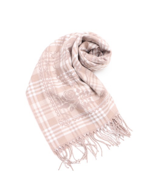 【アイテム説明】オリジナルのチェック柄に繊細な額縁風の模様とバラのシルエットを織り出したストールです。裏表で2通りの表情が楽しめるのも嬉しい仕様。マフラー風に巻いても、肩から掛けても可愛く着用いただけるアイテムです。