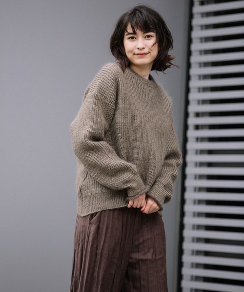 □2020 AUTUMN&WINTER COLLECTION□<素敵なあの人 2月号掲載>◆シンプルながらも存在感は別格!上質感あふれるニットプルオーバー◆<MATERIAL>希少なキッド・モヘヤとポリエステルのリリーヤーンを掛け合わせた暖かみと軽さのある編地です。キッド・モヘアは、手触りがなめらかでシルクのような光沢があり、発色が良い素材です。暖かい機能性を備えながら、心地よいほど軽いのも特徴です。ポリエステル100%のリリヤーンは、スポンジ性やストレッチ性があり着心地が良く、速乾性にも優れています。非常に軽く、膨らみのある2素材を引き揃えている為、見た目によらず軽い仕上がりですが、十分な保温性があります。少し張り感のある素材と、エアリーな素材の相反する組み合わせで、畦の目や成型柄もはっきりと表れるので、単純ながら存在感がありますが、同色系で引き揃える事で編地に一体感を出し、合わせやすい編地に仕上げました。<DESIGN>高級感と存在感のある編地の特徴を最大限に活かし、シンプルでコンパクトに着られるプルオーバーを作りました。あたたかさと感じられる中肉厚手の5GG片畦編みで、ニットならではのヘラシの技術を取り入れ、両脇に入った斜めのラインがさりげなくアクセントになっています。編地の方向に合わせ、ヘムラインも少し逆カーブさせることで動きのある1枚に仕上げています。袖口の編み出しはモヘアのみを天竺で編立て、軽さと女性らしさを感じられるデザインを加えました。<COLOR>■ダークブラウン:赤みを抑えた上品なキレイめブラウン。シックで大人っぽく、細見え効果も期待できます。■ライトベージュ:アイボリー寄りの明るく上品なベージュカラー。スタイリングの色も選ばず、着こなしやすい万能カラー。■レッド:朱赤に近いしっかりと色づいたカラーです。顔映りも良く、華やかな印象になるおすすめのカラーです。*お取扱いについては、商品についております品質表示にてご確認ください。洗濯:ドライクリーニング.............................≪INFORMATION ≫............................▼商品のお気に入り登録▼『♡』マークを押してお気に入り登録して頂いた商品は、セール開催の通知やクーポン発行などのキャンペーンなど、お得な情報をいち早く受けとる事が出来ますので、ぜひご登録ください。