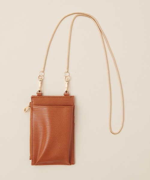 【2020AW natural couture】お出かけに必要な主要アイテムをミニマムにまとめられるショルダータイプのスマートフォンケース 正面のポケットにはスマートフォンを収納することができ、 背中面にはカードを入れるスリットポケットが2つあるので使用頻度の高いICカードなどを入れておくとさっと使え キャッシュレス化が進む今、欠かすことのできないアイテムです。 程良くマチのあるファスナーポケットの中に2つのポケットがついているので お札を入れたり、大事なカードはこの中に入れておくと安心です。 そのほか小銭を入れたり、キーリングもついているので鍵の紛失も防げ防犯面も考慮。 オン・オフ問わず、オールシーズンで活躍してくれる無地に加え、 リザード調の型押しがちょっぴりスパイシーなリザード柄の2種類をご用意しました。 ちょっとしたお出掛けや、なるべく身軽でありたいお食事会などにもOKな2マイルアイテムです。 ショルダー紐は、スタイリングを邪魔しない華奢なゴールドチェーンで仕上げました。 同型で329925363:【WEB限定・配色チェーンスマホショルダー】もご用意しておりますのでご覧下さいませ。