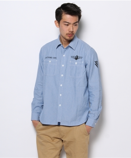 シンプルなプリントが施されたオーセンティックなシャンブレーシャツ。 model:H184 B90 W73 H90 着用サイズ:MEDIUM