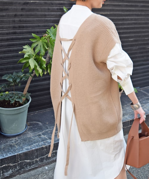 ◆アイテム詳細◆ 【Marient 20A/W】 フロントは深いVネックにし、後ろのレースアップがポイントのニットベスト。 ふくらみのある上質なウール混糸で仕上げ肌心地も抜群。 シャツやカットソーとのレイヤードスタイルが特におすすめです。 ーーーーーーーーーーーーーーーーーー 【COLOR】ベージュ・ブラック 【SIZE】サイズ FREE 平置き(㎝) 着丈75 身幅54 肩幅53 裾幅48 【素材】ポリエステル90% 毛10%