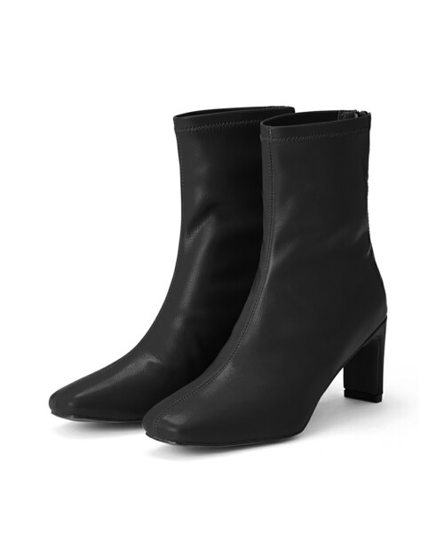 スクエアトゥデザインが足元をスッキリと見せてくれる。 太めのデザインヒールで安定感もあり、お洒落心をくすぐるポイントに。 ストレッチ素材で履き心地も抜群。