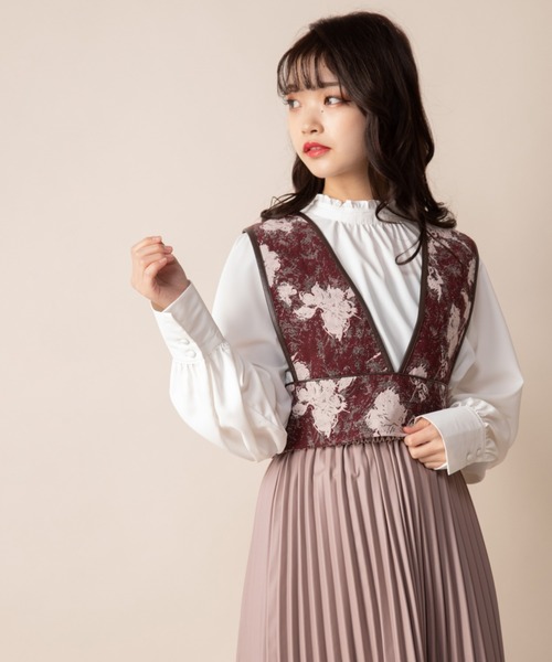 レトロキュートなジャガードビスチェ <MATERIAL>しっかりとしたジャガード素材。抽象的な花柄が大人っぽいデザインの生地です。 ハリがあり綺麗な形がキープできる肉感です 伝統的なジャガードと合皮のパイピングのコントラストが印象的です。 <DESIGN> 深いVネックとジャガード素材が印象的なデコラティブなビスチェ。 アンティークを思わせる柄がコーデをぐっと引き締めてクラスアップしてくれること間違いなしです。 合わせる物に悩んでしまいそうな柄ビスチェですが、そんな時はモノトーンのシンプルなカットソーやブラウスに合わせて見てください。 お手持ちのシンプルトップスが今っぽコーデに早変わりしちゃいます♪ 両サイドにボタンがついていて、どちらからでも開閉可能です。背面には渡しがついているのでなで肩さんでもずり落ちてこずに安心♪ ハーネスベルトのようにバックシャン見えするのも嬉しいポイントです。 <COLOR> レッド:レディな華やかさが溢れる優しいワインレッドは秋冬の差し色にピッタリなカラー ブラック:ブラックですがグレイッシュな花柄がアクセントになり重くならない!引き締めにもぴったりな軽やかブラックは重宝します。 <CARE> ※詳しくは製品に付属している洗濯表示をご参照ください。 ※撮影環境により、多少実際のカラーと異なる場合がございます。 また、携帯やスマートフォン、パソコンなどの画面上と実物では多少色が異なって見える場合がございます。