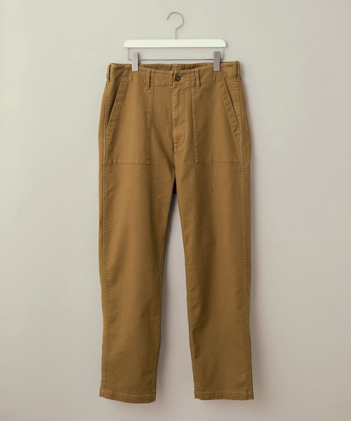 【Material】 左綾ツイルの畝が非常に凹凸感ありながらストレッチ効いた素材を使用したベイカーパンツです。 通常のチノパンと綾目の生地を比べると、通常右上がりの綾目のものが多いですが、左上がりで単糸使いはレアです。 カジュアルダメージ加工入れているので、古着のミリタリーウエアにはない上品だけど、カジュアルな要素が特徴です。 【Design】 シルエットは深めの股上で、米軍実物のベイカーパンツより少しテーパード効かせて、コーディネートに取り入れやすくしてます。サイドは二本針の巻き縫い縫製など、ミリタリーデティールに忠実に作り込んでます。ボタンとボタン付け糸は配色してるので、畳み展開の時にちょっとしたアクセントになるようにしています。 無骨なシルエットの中にも、スタイリッシュで遊び心ある珠玉の1本です。 【推奨サイズ】 サイズM:身長~175cm サイズL:身長176cm~ ※標準体型を基にした目安になります。