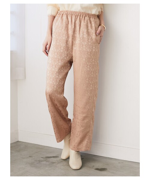 高級感のあるジャガード柄が華やかな雰囲気たっぷりのパンツ。 光沢感のあるサテン素材が着こなしにエレガントなニュアンスをプラスします。 明るくフェミニンな印象のカラーリングも魅力的。お出かけスタイルやちょっとしたパーティにもピッタリです。