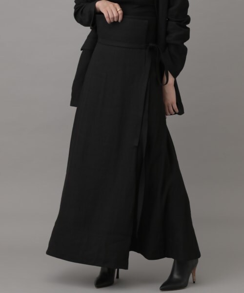 -fabric-イタリアの老舗素材メーカーのLanificio di Pray 社の素材を使用したスカートになります。麻とヴィスコースのハイブリット素材になり、麻らしいドライなタッチとヴィスコースの落ち感が今年っぽい質感になっています。-design-ウエストは今回のテーマでもあるORIGIN のイメージからくる伝統的な柄をインスピレーション源に刺繍を施しています。シルエットはロングラップスカートになっておりたっぷり素材を使った贅沢な仕様になっております。