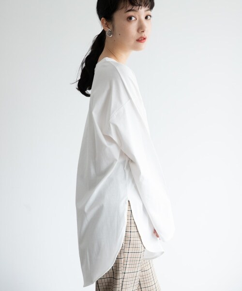 ニットや裏毛とのレイヤードスタイルに!ラウンドヘムカットソー。 少し着丈を長めに設定して、レイヤードしたときにバランス良く着こなせるようにしました裾のラウンドが今年らしく◎重ね着しやすいように少し薄手のきれい目な綿天竺を使用しています。ボトムスはスカート、パンツどちらでも合いますが、丈が若干長めなのでカラーパンツなどと合わせるとすっきりして見えるのでお勧めです!