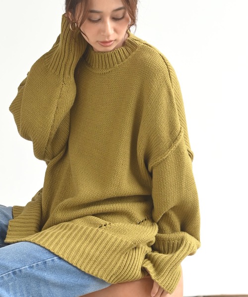 リラクシーにおしゃれを楽しむビッグニット オーバーサイズでリラクシーに着られるこなれニット。 体系カバーもしてくれるたっぷりのサイジングで抜け感のある女性らしい着こなしが楽しめます。 また、華奢見えも叶えてくれるドロップショルダーもポイント。 バックはセンターシームとスリットで今年らしいデザインに仕上げました。 フロントは裾に針抜きをあしらって重ためのシルエットに軽やかさをプラス。 開きすぎないクルーネックがだらしなくならずきれいめに仕上げてくれます。 裏地なし 伸縮性なし 中厚 編み加減や染めの具合でデザインやサイズ等異なる場合もございます 洗濯:手洗い可